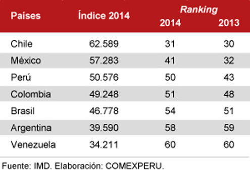 El informe elaborado por el IMD sostiene que el Perú ha retrocedido en materia de competitividad, al pasar de la posición 43 en 2013 a la 50 en 2014, ubicándonos así detrás de Chile y México en cuanto a los países de Latinoamérica. Este es el resultado de lo que no se viene haciendo en materia de políticas públicas para nuestra competitividad. Señores del Consejo de Ministros, ¿por qué hemos retrocedido?