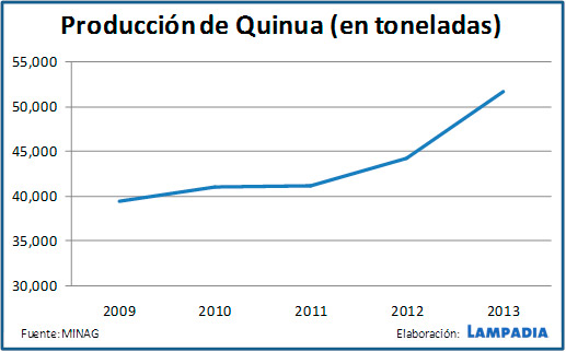 Por todos estos beneficios, la exportación de la quinua, según el MINAG, llegó a US$78.3 millones al cierre del 2013, lo que representa un crecimiento de 150.8% con respecto a lo vendido en el 2012. Este grano se cosecha en 15 regiones del Perú, mayormente en Puno (donde se da con mayores valores nutricionales), y fue exportado a 30 países en el último año (siendo el principal mercado, EEUU con el 60% de participación). En el primer semestre de este año, las exportaciones a EEUU han crecido 239% con respecto al año anterior, alcanzando los US$ 50 millones.