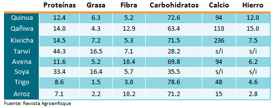 Entre los otros granos andinos más nutritivos se encuentran la kiwicha (o amaranto), la qañiwa y el tarwi. Estos productos tienen un alto valor proteico, mayor al de los demás cereales, y un gran potencial de popularizarse a nivel mundial.