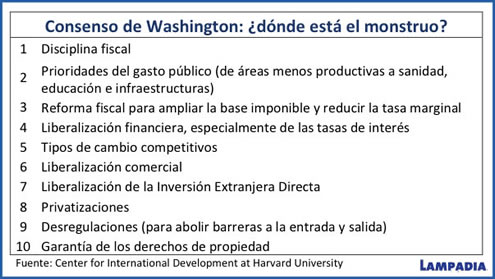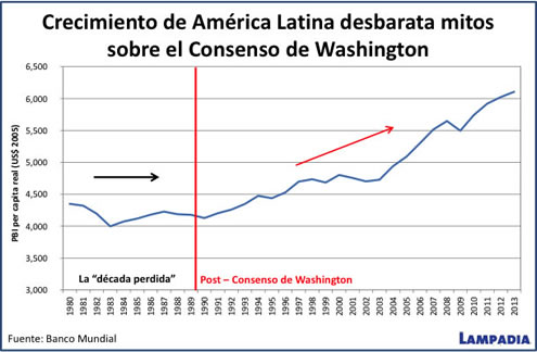 [Dani Rodrik y los que llenan de epítetos a los llamados neoliberales pueden decir lo que quieran del Consenso de Washington, pero más allá de que ninguna obra humana es perfecta, gracias a los postulados de dicho consenso, América Latina dejo sus problemas económicos, que como dice Liliana Rojas-Suarez, siempre se originan en el exceso de endeudamiento. No podemos dejar de reconocer que lo que se hizo en la región en términos de desregulación, privatización y manejo de deuda, permitió una recuperación espectacular de toda la región, que finalmente determinó que no fuéramos ni los protagonistas ni las principales víctimas de la última crisis financiera, que sigue causando profundos problemas. El que después, los países más ideologizados, no hayan sabido aprovechar los buenos años del nuevo siglo y hayan destruido sus economías, como Venezuela, Argentina, y en buena medida Brasil, es otra cosa. Creo que Rodrik debe buscar un mejor ejemplo para ilustrar este punto. Más abajo publicamos el Consenso de Washington y la evolución del producto de la región, para que el lector pueda juzgar si encierra algunos monstruos.]