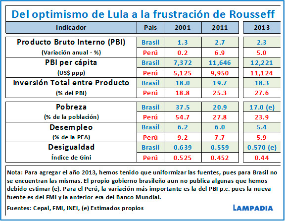 A pesar de estos esfuerzos y de sus masivos y millonarios programas asistenciales, su tasa de crecimiento y sus índices sociales no resisten comparación con los peruanos. Esto se puede observar en la tabla siguiente, una versión actualizada de la publicada por Lampadia anteriormente. Para ello, al incluir los datos del 2013, hemos tenido que homogenizar las fuentes, puesto que hasta ahora, el gobierno de Brasil no ha publicado los indicadores referidos a la pobreza, sospechosa falta de transparencia en un año electoral.