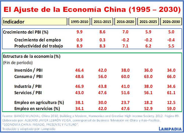 En cuanto a la ralentización de su crecimiento, es evidente que en el nuevo escenario global después de la crisis del 2008, obligaba a China a ajustar su economía para evitar un sobre calentamiento y promover un mayor consumo interno. Hasta entonces su economía estaba Impulsada por las exportaciones y la inversión. Este ajuste lo emprendieron solo pocos meses después de la caída de Lehman Brothers (setiembre 2008). Hoy tienen una economía menos orientada a la industria, con mayor énfasis en el sector de servicios y al consumo interno.