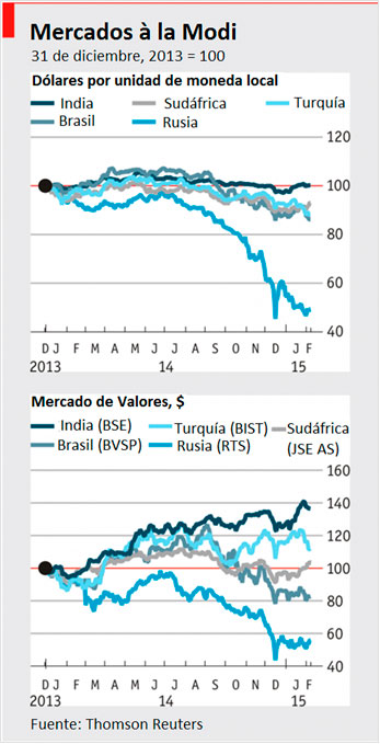 India ha sido una luz entre los mercados emergentes; las cifras del PBI publicados hoy darán una idea de cuan brillante. India importa el 80% del petróleo que utiliza y, por lo tanto, se ha visto beneficiada por los precios más bajos. Su gobierno pro-reforma tiene un mandato saludable. Los extranjeros siguen siendo compradores entusiastas de sus activos: el mercado de valores de la India y su moneda han superado a sus pares. El FMI prevé que la economía de la India pronto estará creciendo más rápido que la de China. Sin embargo, nadie está muy seguro de cuán rápido está creciendo ahora. La oficina nacional de estadística ha actualizado recientemente el año de referencia con el cual se calcula el PBI y se actualizó el crecimiento para 2013-14 (de abril a marzo) de 5.1% a 6.9%, un número que se encuentra en desacuerdo con otros indicadores más débiles. Hoy se dio a conocer una estimación para 2014-15: los meteorólogos habían previsto un crecimiento de alrededor del 5.5%, pero las revisiones de los datos del año pasado sugieren que ahora la cifra podría ser aún mayor.