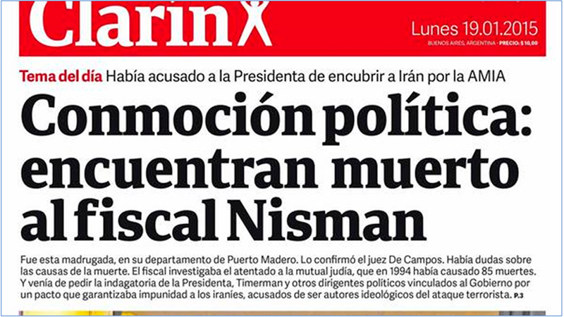 Clarín en una edición de emergencia, tituló: “Conmoción política: encuentran muerto al fiscal Nisman”. La mañana de hoy, Nisman iba a ir al Parlamento para dar mayores detalles sobre la acusación.