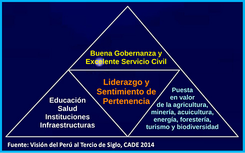 El reto de ponernos al día y, de prepararnos para un futuro tan exigente como el que se nos viene, debe incluir un conjunto de agendas que deben ser enfrentadas simultáneamente. En CADE 2014, IPAE revisó su propuesta de visión de futuro, ejercicio en el que se identificaron tres agendas: de gobierno, social y productiva. Ver el siguiente esquema: