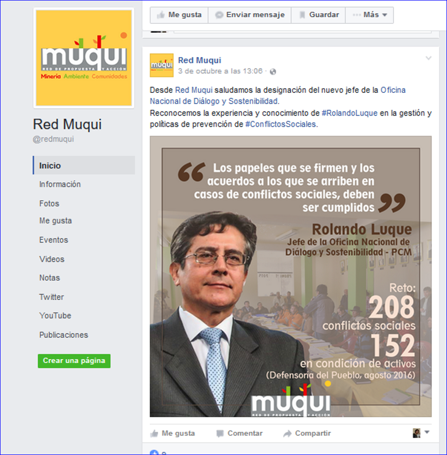 Por ejemplo, la coordinadora de ONGs post extractivistas, Red Muqui, afirma en su cuenta de Facebook: