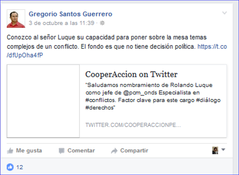 Gregorio Santos en su cuenta de Twitter celebra su nombramiento pero se lamenta que Rolando Luque no tenga un mayor poder de decisión: