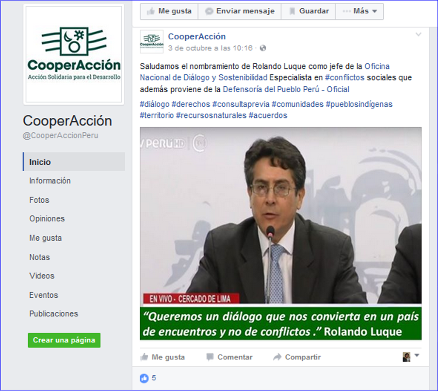 Como se visualiza en la respuesta de CooperAcción, ellos también saludan la designación de Rolando Luque. Sin embargo, llama la atención que el Twitter ha sido borrado de su cuenta. Aunque en cambio, en su cuenta de Facebook sí saludan el nombramiento de Rolando Luque: