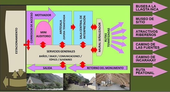Al tener como inicio de la experiencia un Centro de visitantes, que finaliza en un video de “mensaje, inducción y difusión” del conocimiento “oficial” del lugar; se migra del modelo actual sostenido en el “recorrido, la fricción y el despliegue físico”, hacia uno nuevo basado en la interpretación y transmisión de contenido; acorde a su naturaleza de Patrimonio Mundial.