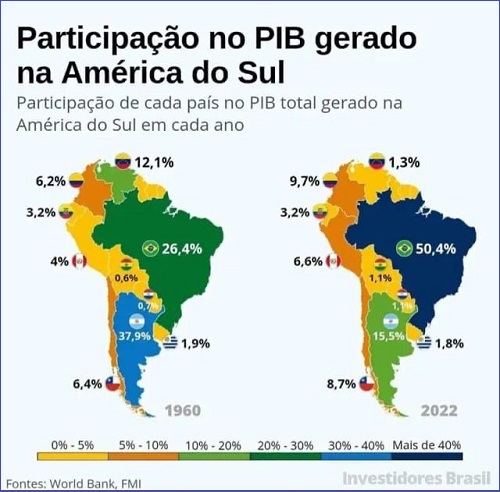 Llega a mis manos un mapa económico fascinante (Investigadores Brasil). Consiste en dos mapas de Sudamérica de 1960 y 2022, donde se contrasta la proporción del PBI que tenía cada país del subcontinente respectivamente en esos años. Lo que más llama la atención es el descomunal hundimiento de Venezuela, seguido por Argentina.