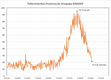 En la conferencia de prensa de ayer del presidente de la República y sus ministros, se presentó el siguiente gráfico, que muestra cómo la curva del número de fallecidos por toda causa registrado por el Sinadef, viene cayendo apreciablemente desde el 2 de agosto. Al respecto el presidente comentó que ello se debía a las acciones que ha venido realizando el gobierno (cuarentenas focalizadas, restricción dominical, Operación Tayta) y a la responsabilidad de la población.