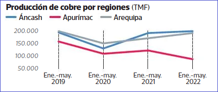 Además, durante los primeros cinco meses del año, los volúmenes procesados se mantuvieron por debajo del 2021 y, en algunos casos, del 2019, antes de la pandemia. La producción cuprífera disminuyó 0,3% entre el período de enero y mayo del 2022 versus el similar tiempo del 2021.